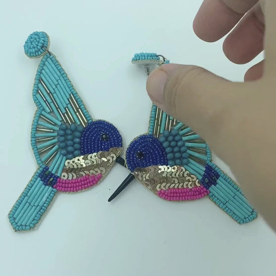 A shimmering ode to wings and whimsy. Inspired by the freedom of flight and the glow of twilight, these handcrafted hummingbird earrings blend playful pinks, ocean blues, and golden sequins — turning every outfit into a verse.