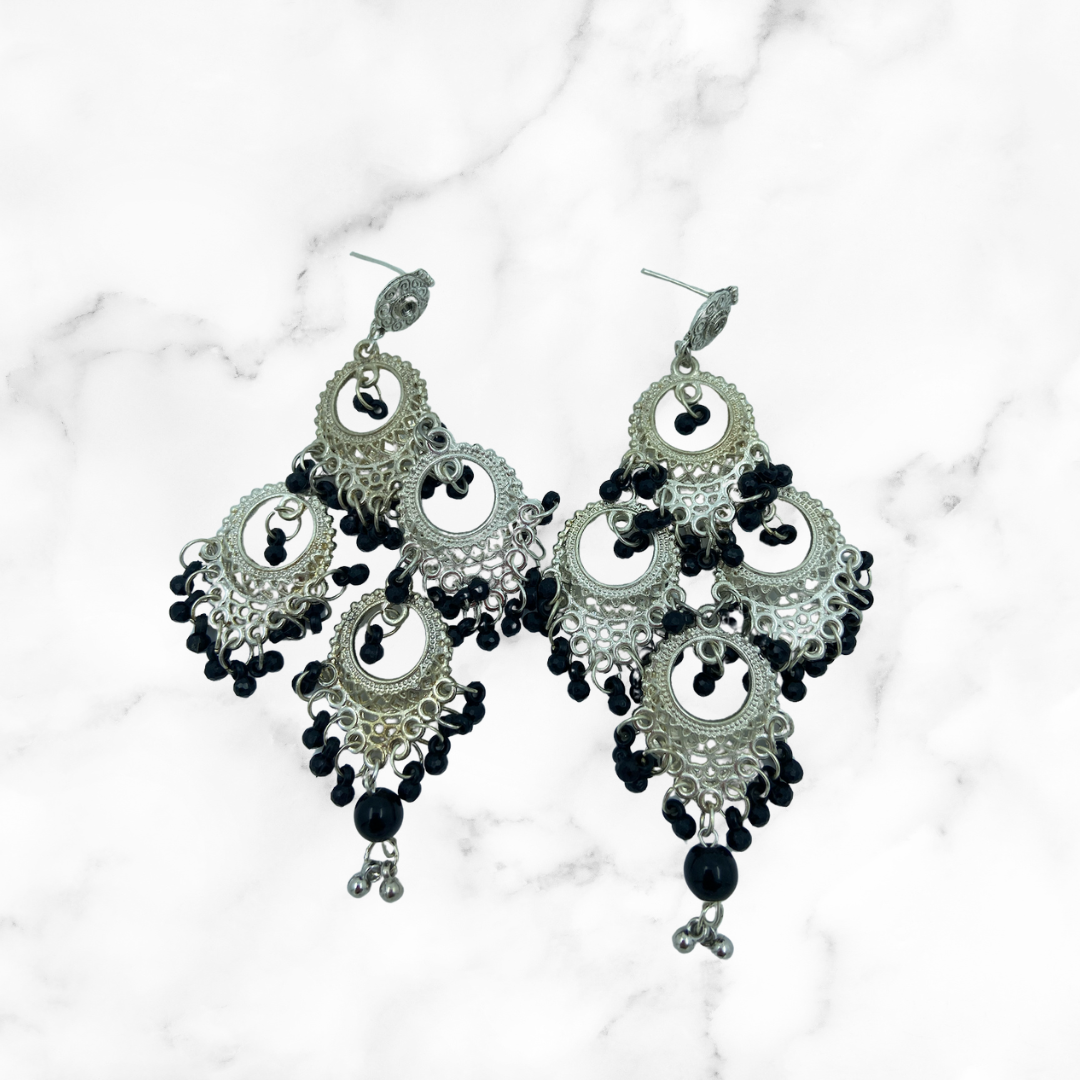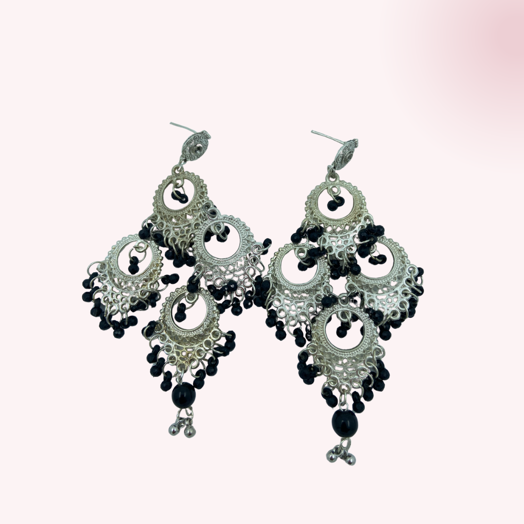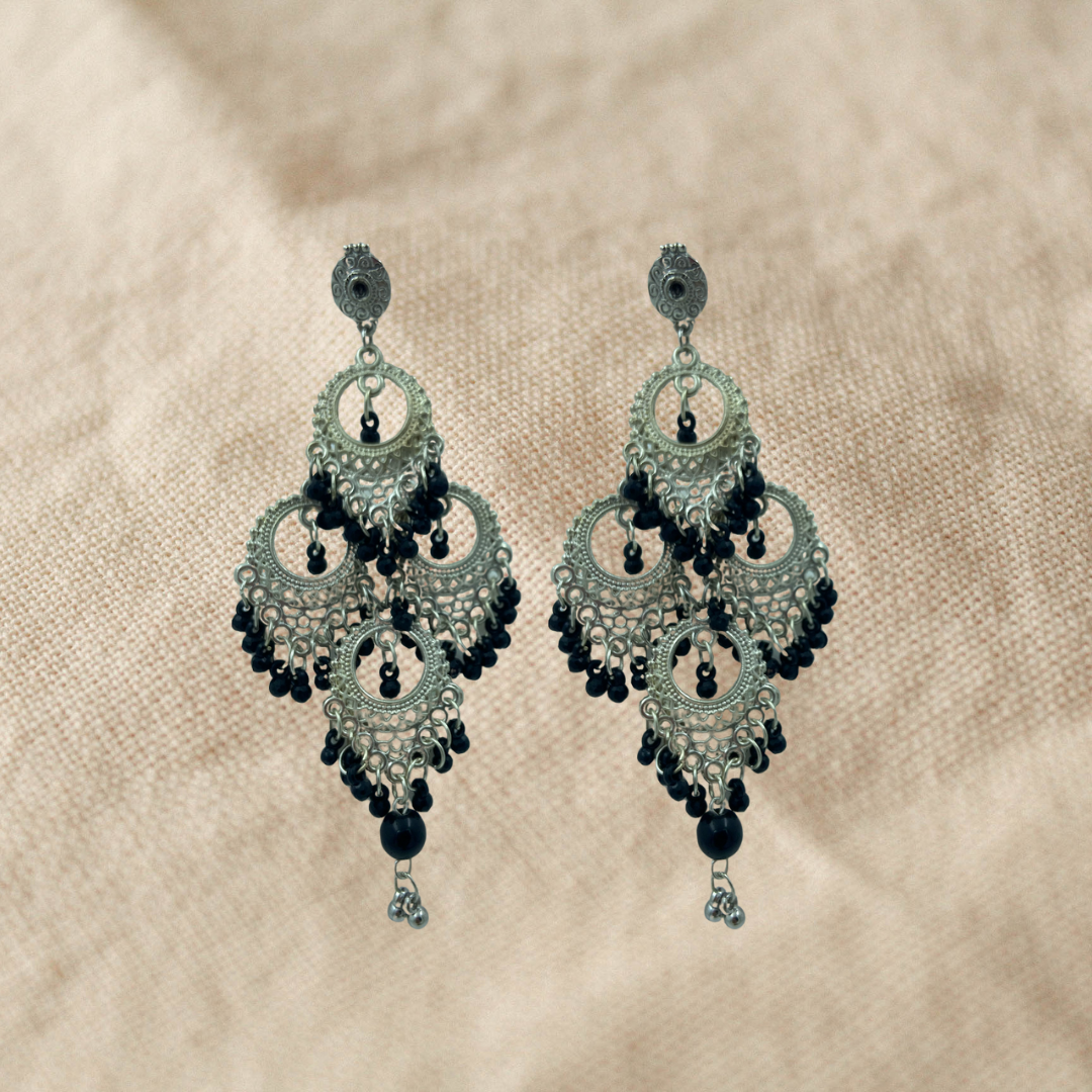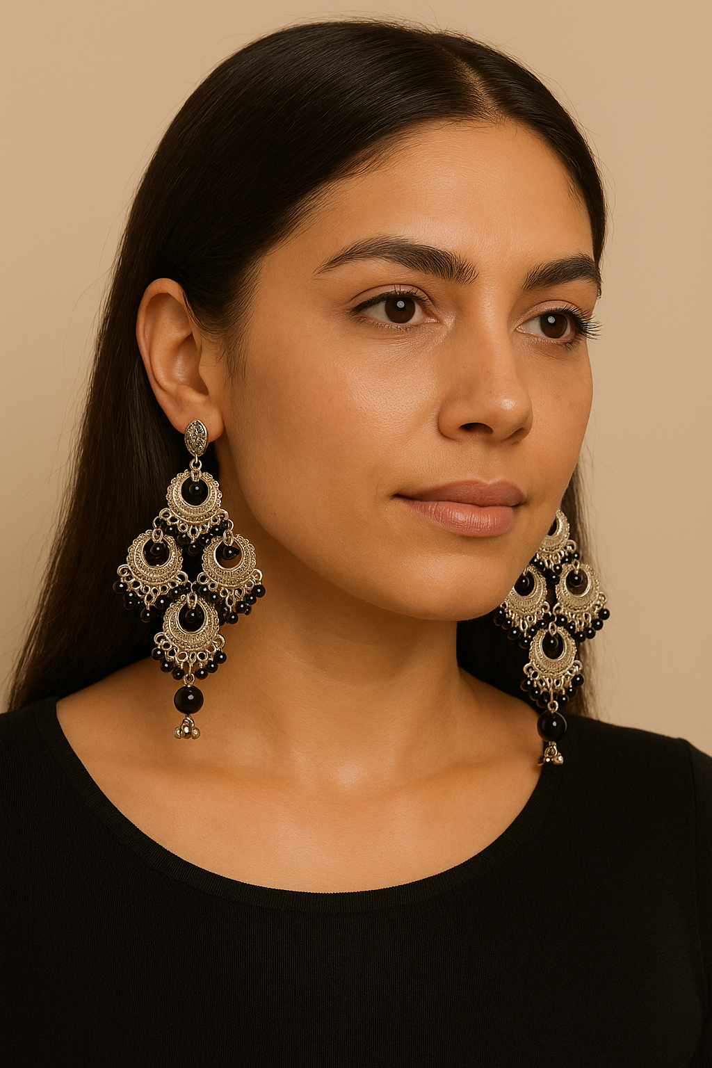 These handcrafted oxidised earrings blend intricate filigree design with cascading black beads, evoking the allure of a moonless night. Lightweight yet statement-making, Kaali Raat is perfect for festive evenings, weddings, or when your outfit needs a touch of vintage drama. Pair them with sarees, lehengas, or even a bold black dress — and let the night speak.