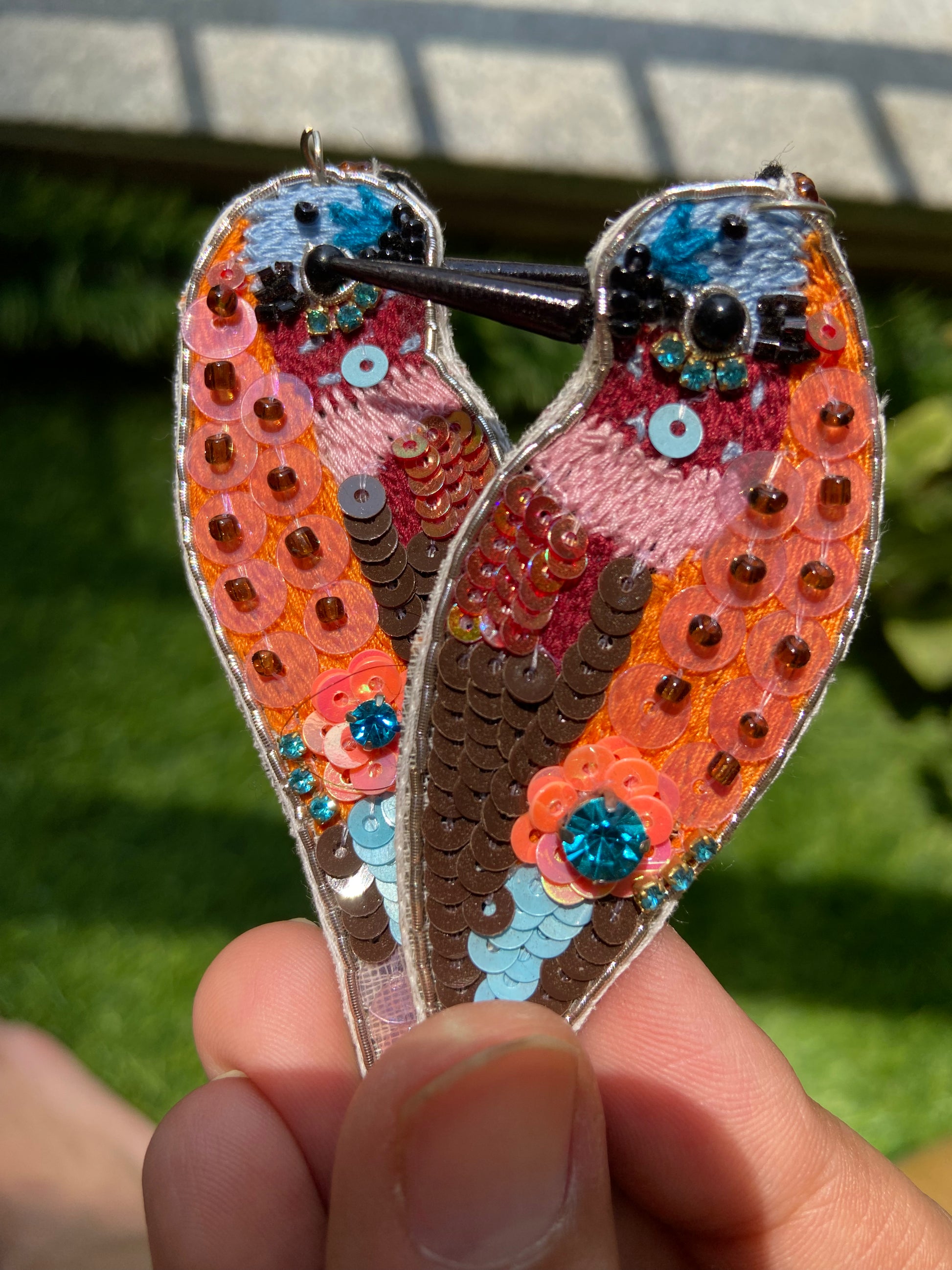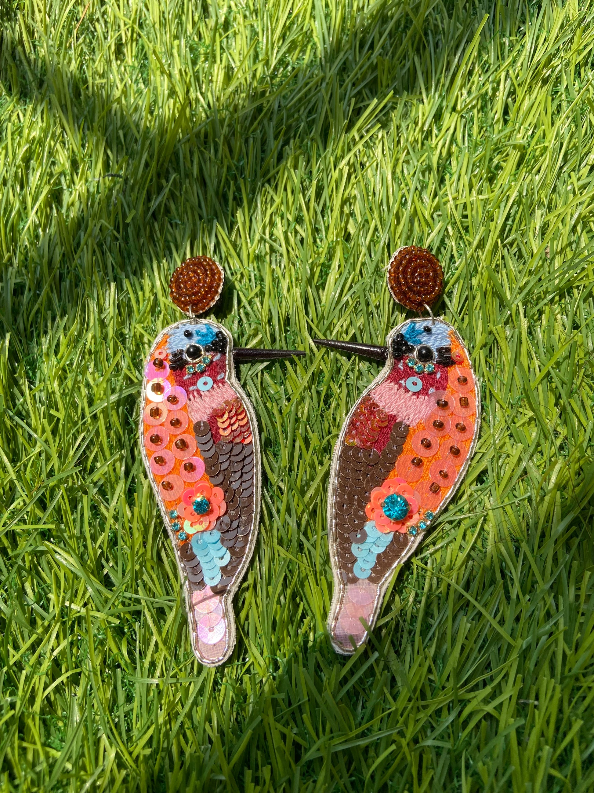 Introducing "Sunset Symphony" - a mesmerizing ensemble of hues that mimic the breathtaking colors of dusk. These bird-shaped earrings are meticulously handcrafted with sequins in shades of peach, orange, red, brown, and blue, creating a harmonious blend of colors. Elevate your style with these statement accessories that exude elegance and charm with every wear.