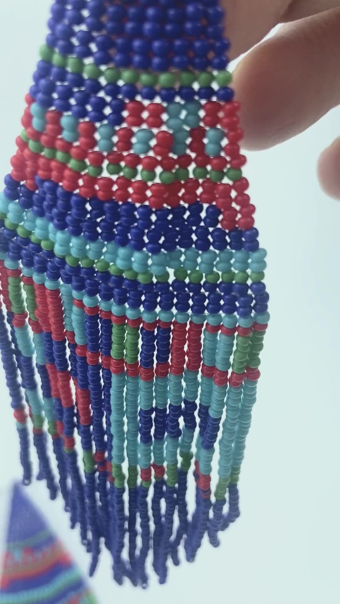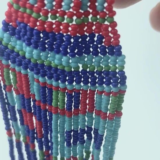 A celebration of color in every thread — these handcrafted earrings feature bold cobalt, turquoise, and red beadwork with a playful fringe. Lightweight and full of movement, they’re designed to swing, shimmer, and stand out wherever you go. Perfect for the free-spirited and festival goers.